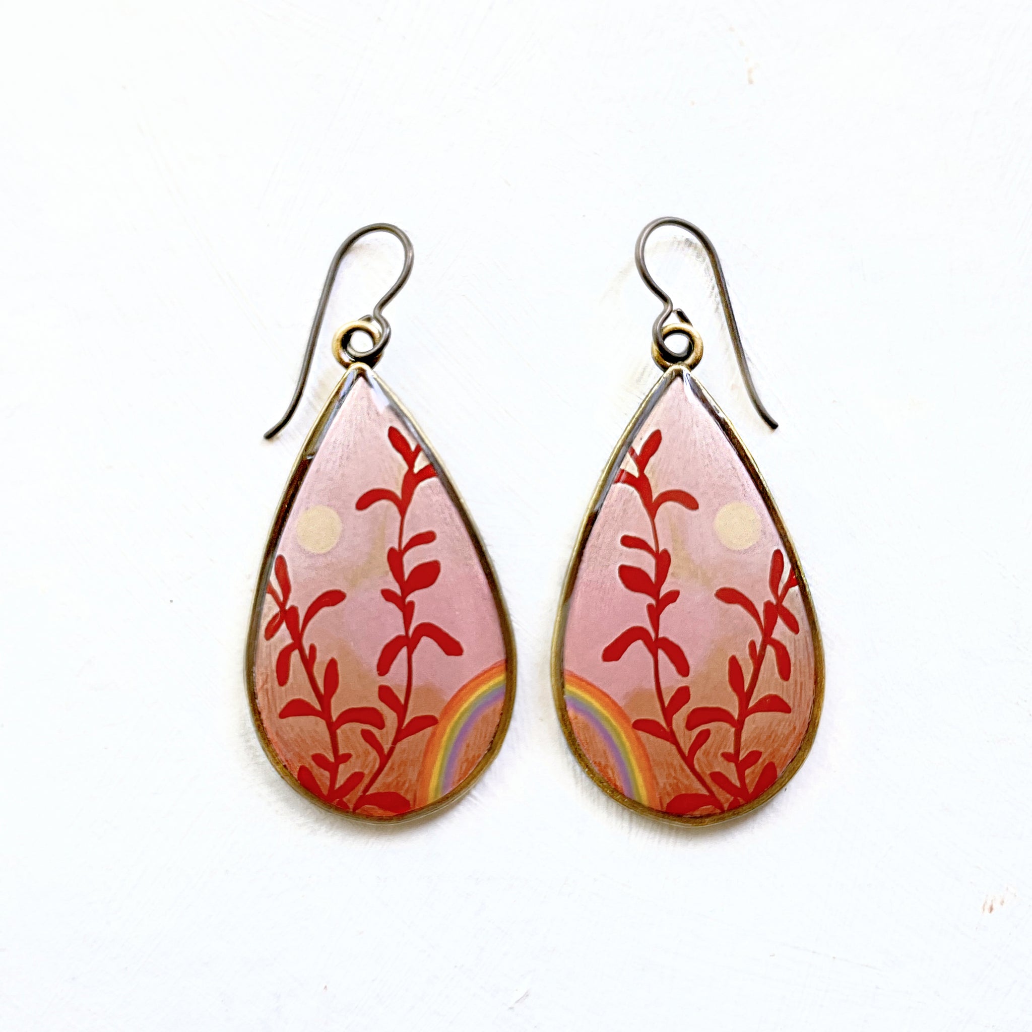 The artwork in these earrings was inspired by the glow of a late afternoon rainstorm. With soft pinks, warm reds, and a subtle rainbow, they bring a touch of color, light, and wonder to your day—just like that radiant feeling of warmth and renewal after the storm has passed.
