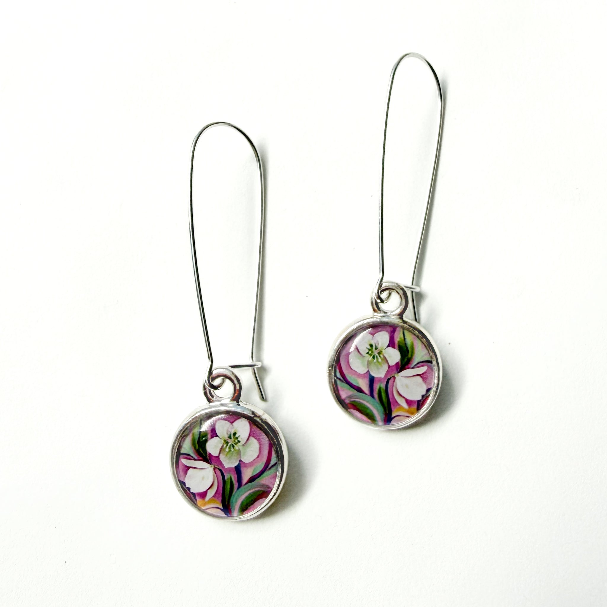 Handmade with dedication and love in my North Carolina studio, every creation in my collection tells a unique story. Each piece begins as an original Seed and Sky painting that is scaled down and transformed into a miniature print. After carefully placing the print in the bezels, I apply a protective layer of resin to preserve its radiant beauty for your everyday enjoyment.
